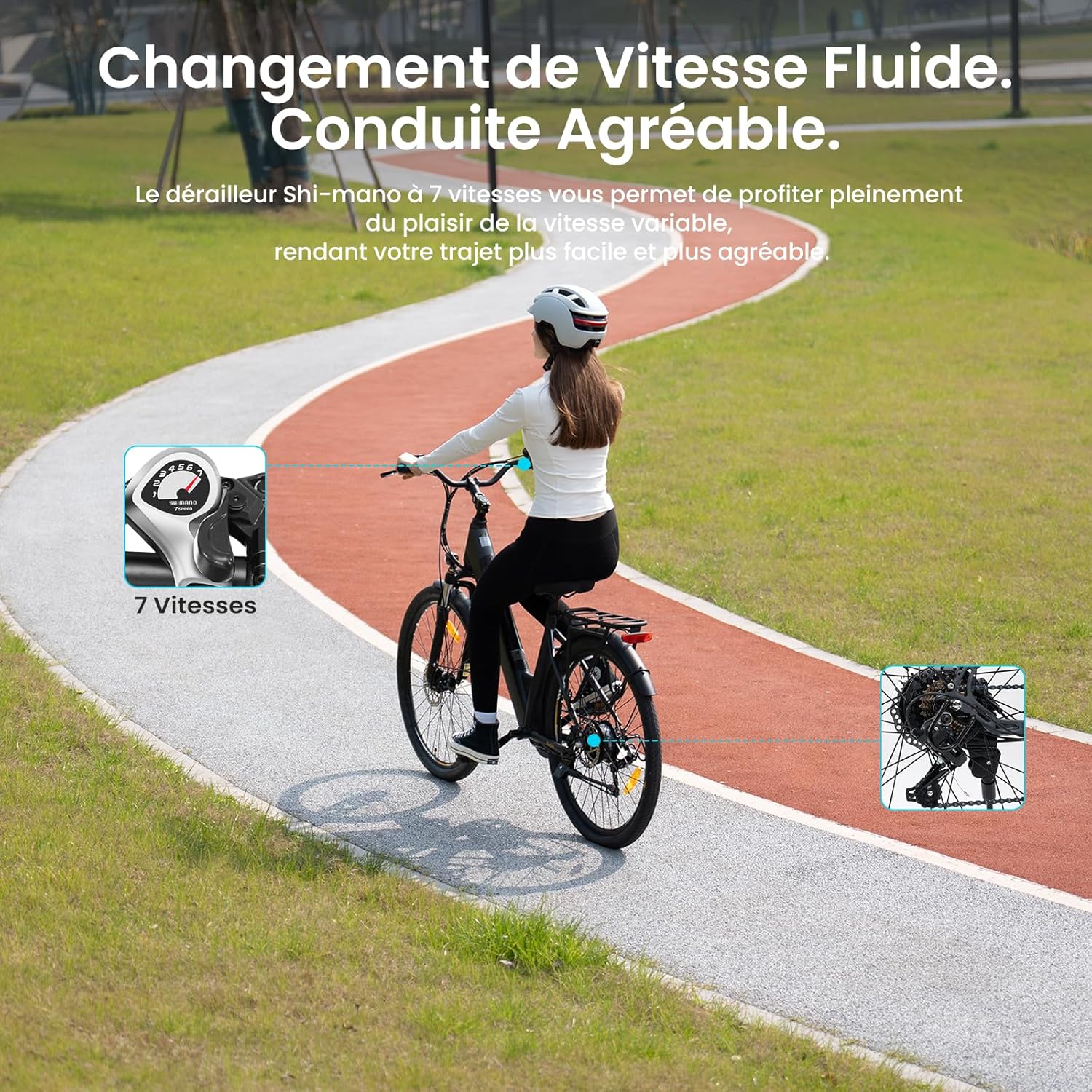 Équipé d’un dérailleur 7 vitesses, ce cycle électrique à assistance centrale s’adapte à toutes les situations : montées, descentes ou routes plates. Ses pneus de 27,5 pouces, robustes et souples, assurent une excellente adhérence sur les surfaces variées, vous offrant un contrôle total et une sensation de liberté à chaque sortie.