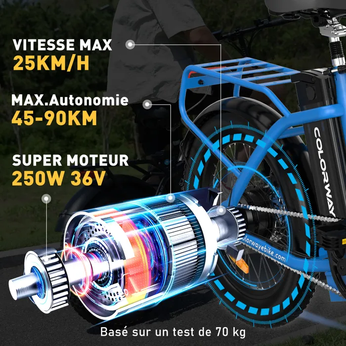 Notre vélo électrique se distingue par son moteur sans balais de 250W, offrant une propulsion efficace et silencieuse. Alimenté par une batterie lithium-ion de 36V 12Ah, il assure une autonomie impressionnante, pouvant varier de 35 km à 90 km selon les conditions d’utilisation. La vitesse maximale assistée est de 25 km/h, conforme aux régulations. Le temps de charge complet de la batterie est d’environ 5 à 6 heures, garantissant une recharge rapide pour vos prochaines sorties.