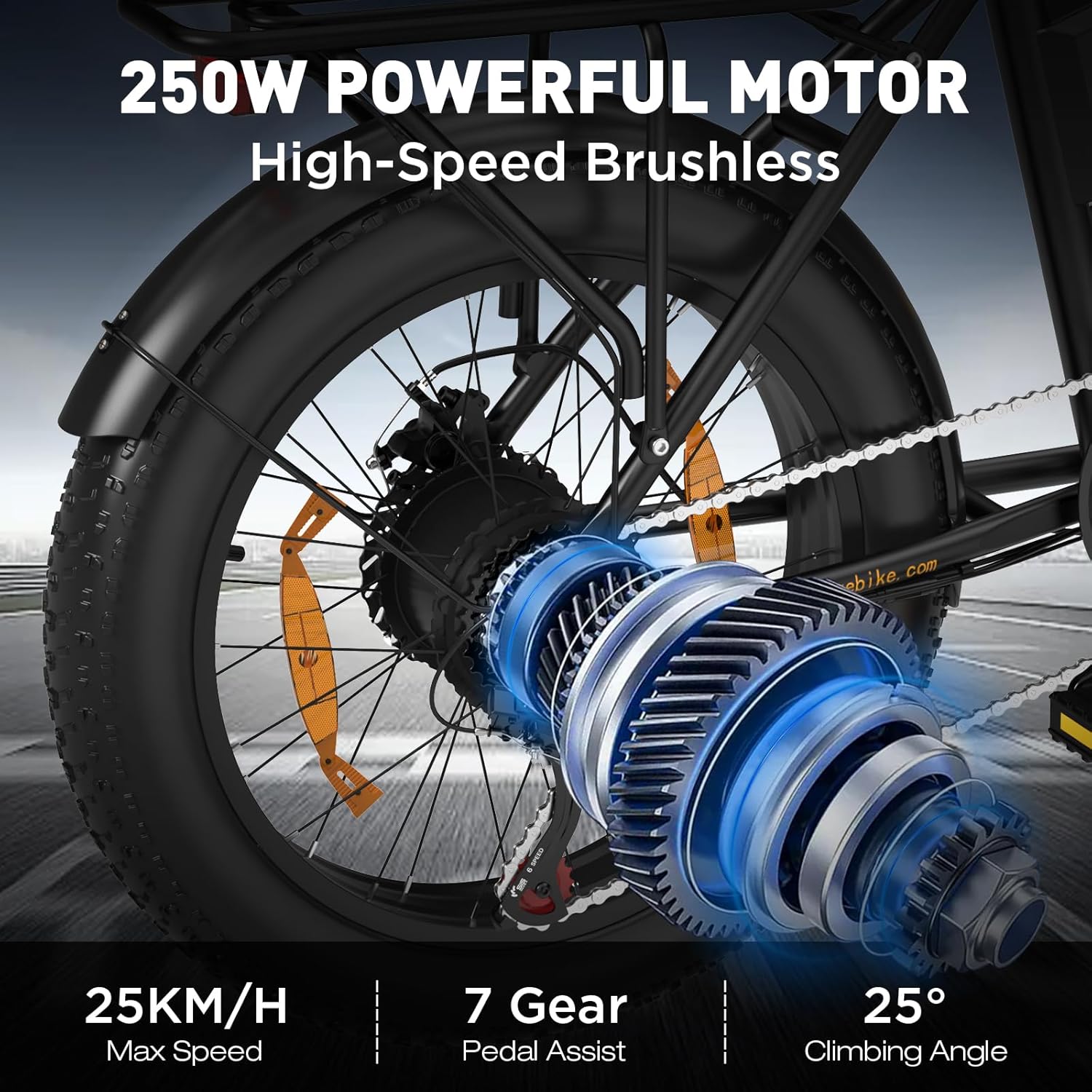 Notre Vélo Électrique Petit Format est équipé d’un moteur de moyeu arrière sans balais de 36V 250W, fournissant une puissance constante et fiable. Cette motorisation permet à notre vélo électrique compact de s’adapter à une multitude de conditions routières complexes, garantissant votre sécurité et votre confort. Les pneus larges de 20 x 4,0 pouces confèrent une forte adhérence et une résistance accrue à la crevaison, vous permettant d’explorer sans souci la neige, les plages, les montagnes ou les routes urbaines. La combinaison du moteur performant et de pneus tout-terrain assure une expérience de conduite fluide et adaptable.