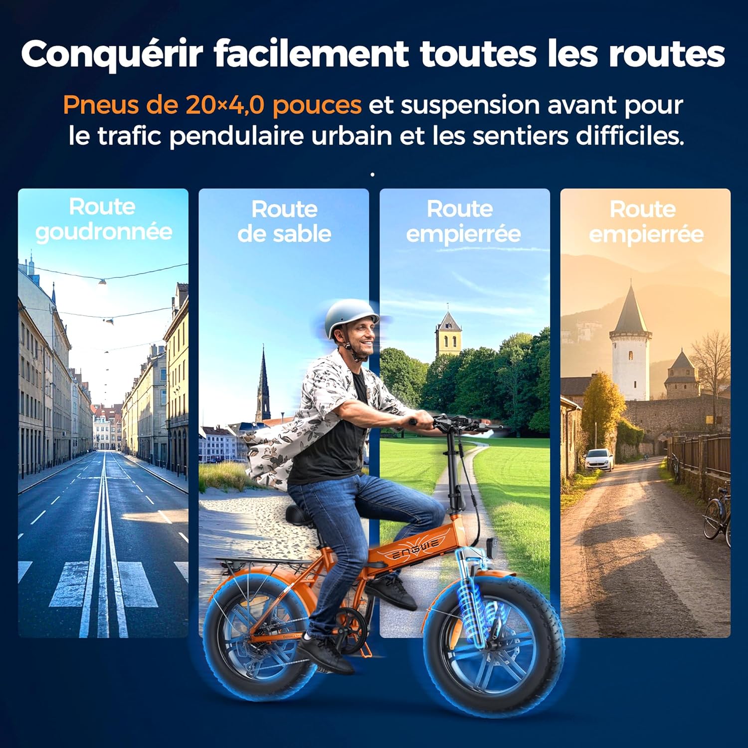 Le vélo pliant électrique avec une capacité de charge de 150 kg est doté d’une fourche à suspension avant, d’un cadre en aluminium 6061 et de roues larges de 20 pouces, ce qui lui confère une grande stabilité sur différents types de terrains, qu’il s’agisse de plage, de neige ou de routes urbaines. Son design pliable le rend également facile à transporter, et sa selle réglable en hauteur assure un confort personnalisé pour tous les utilisateurs.