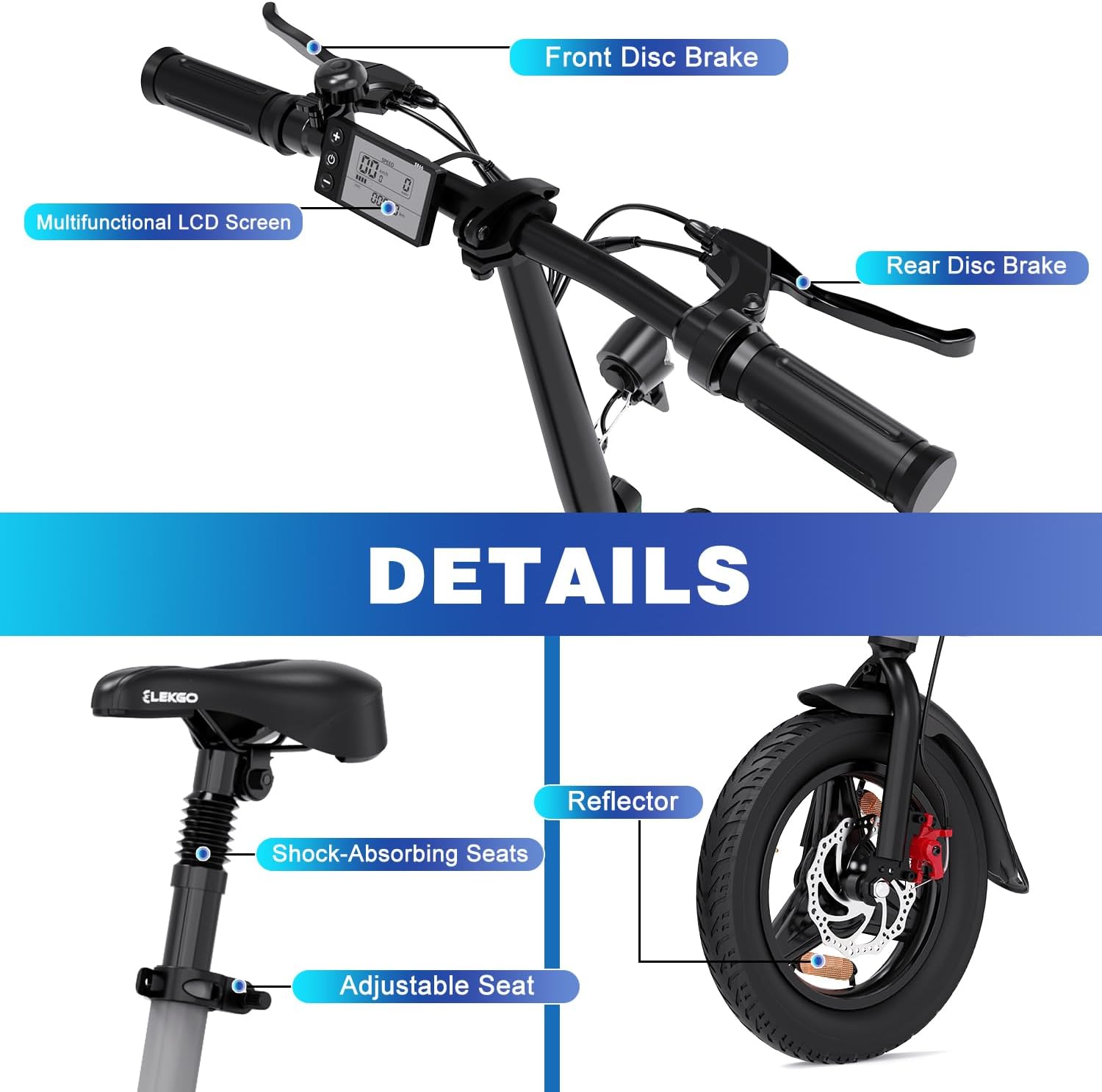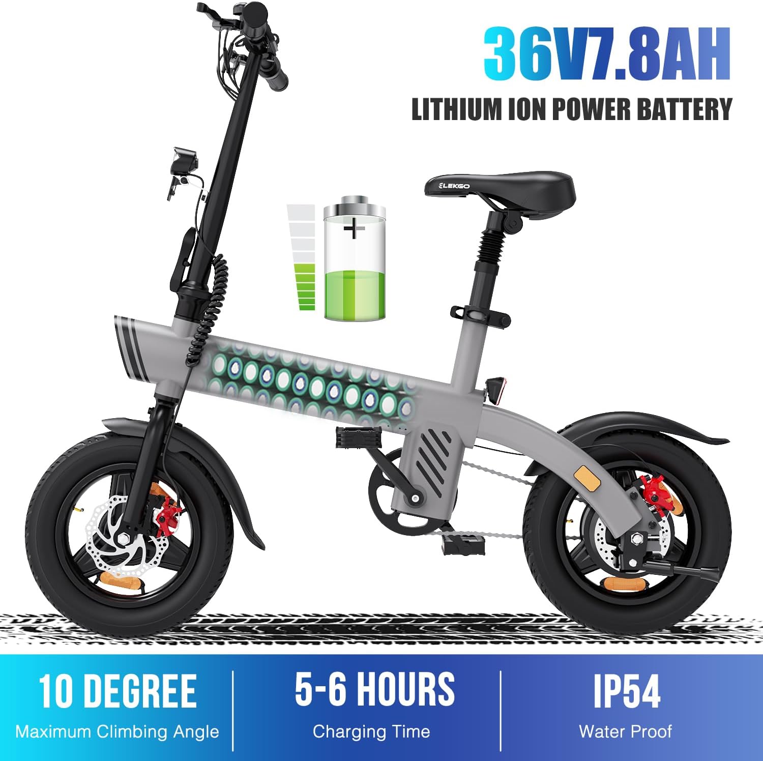 Les freins à disques avant et arrière, combinés à des feux intégrés à l’avant et à l’arrière, assurent une conduite en toute sécurité, de jour comme de nuit. Ce vélo pliable électrifié pour les trajets urbains vous garantit une maîtrise parfaite dans la circulation et par tous les temps.