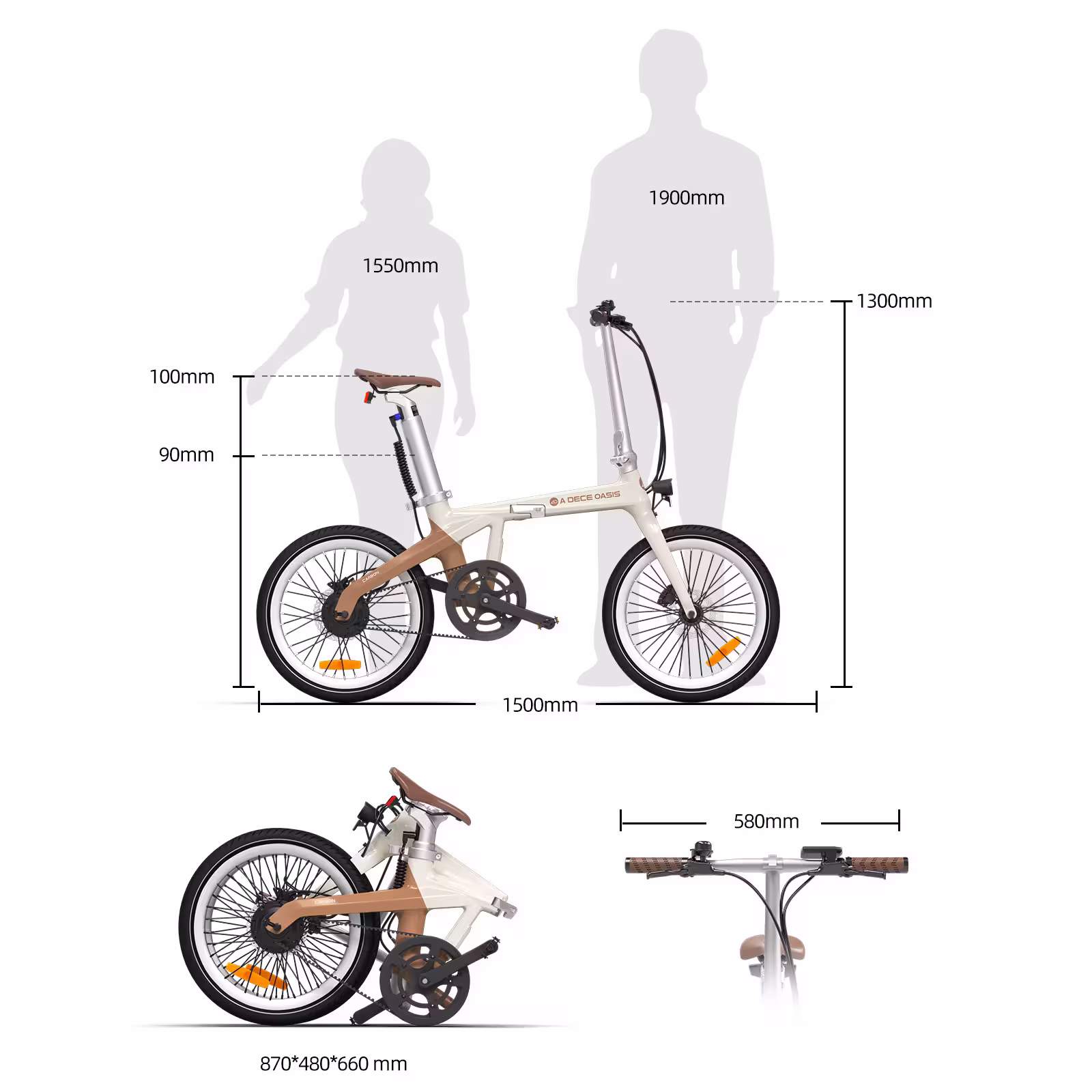 La conception de notre vélo électrique compact prend en compte une large gamme d’utilisateurs. Avec une hauteur repliée de 66 cm, une largeur de 48 cm et une longueur de 87 cm, il est exceptionnellement facile à ranger et à transporter. Il est recommandé pour les utilisateurs âgés de plus de 14 ans et les adultes, avec une stature comprise entre 1,55 m et 1,96 m. Le type d’enjambement bas facilite l’accès, et la présence d’une béquille augmente la commodité au quotidien. La taille de roue de 20″ contribue à sa maniabilité et à sa stabilité.