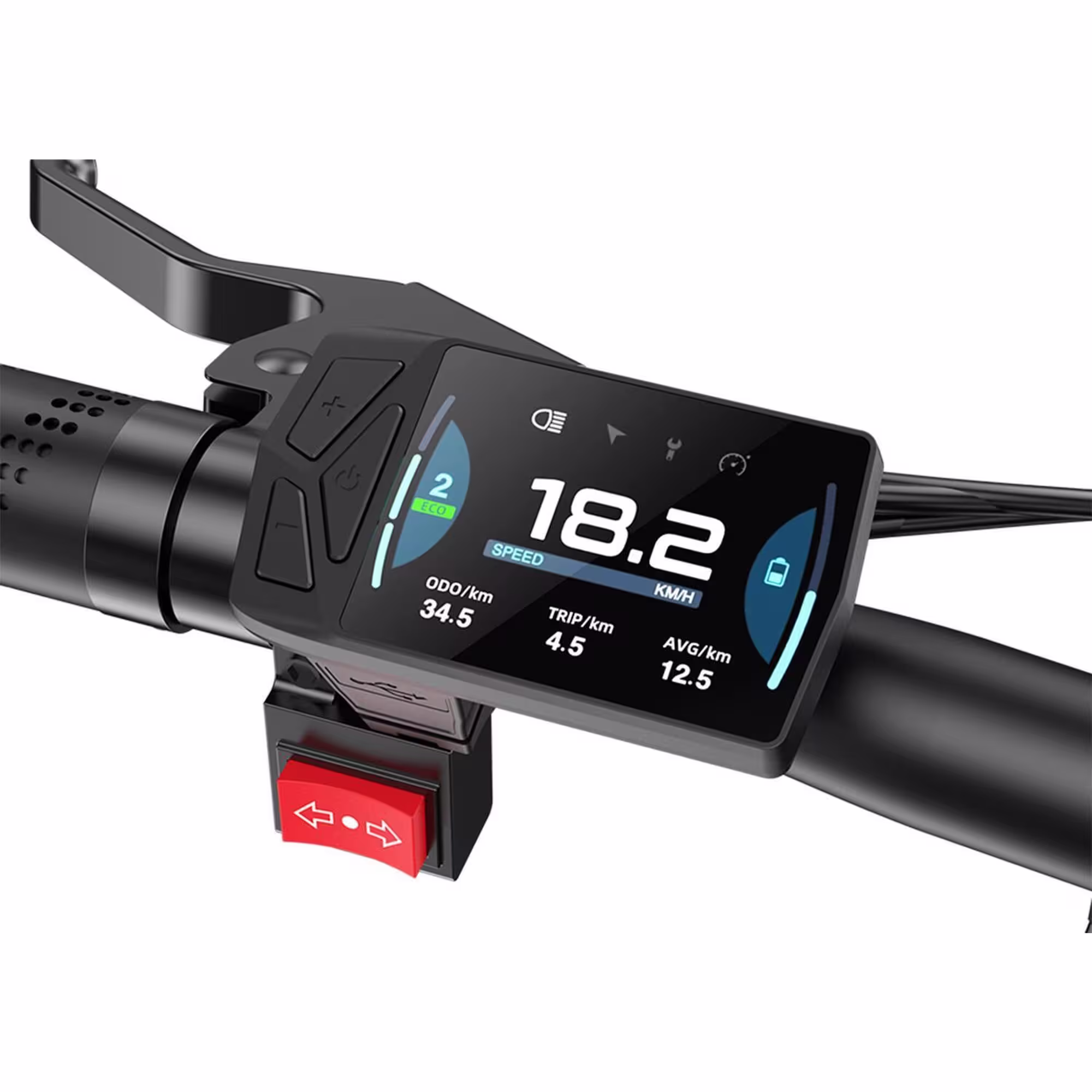 Ce vélo électrique pliant frein à disque est conçu pour offrir un maximum de praticité. Il est équipé de garde-boues pour vous protéger de la boue et de la pluie, d’un porte-bagages métallique pour transporter vos affaires, ainsi que d’un éclairage à capteur automatique pour améliorer votre visibilité. Il comprend également un écran LCD pour suivre vos performances et un support pour smartphone.