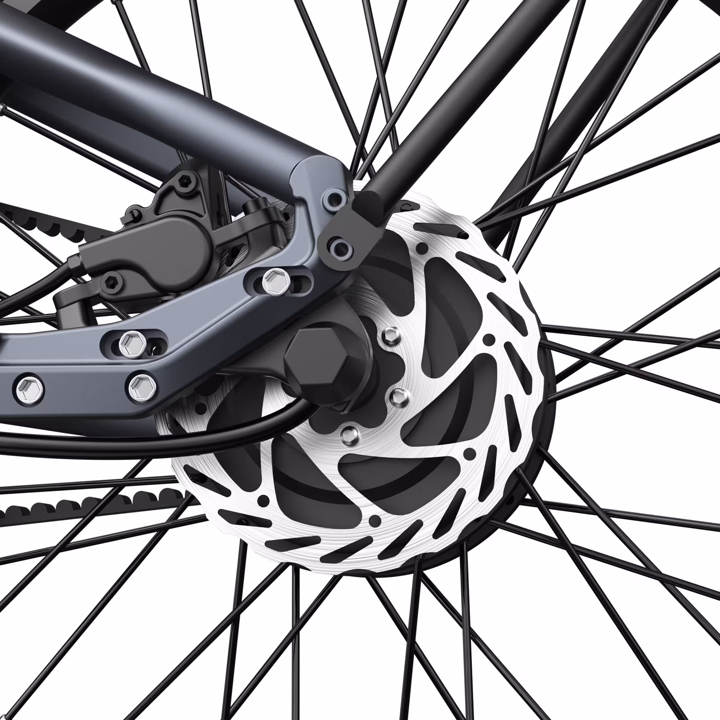 Le vélo électrique pliant à frein à disque dispose de freins à disque hydrauliques avant et arrière, garantissant une puissance de freinage optimale. Ce système de freinage vous permet de vous arrêter rapidement et en toute sécurité, même dans des conditions de conduite difficiles, tout en offrant un freinage doux et silencieux. C’est un atout essentiel pour une conduite agréable, notamment lors des trajets en ville.
