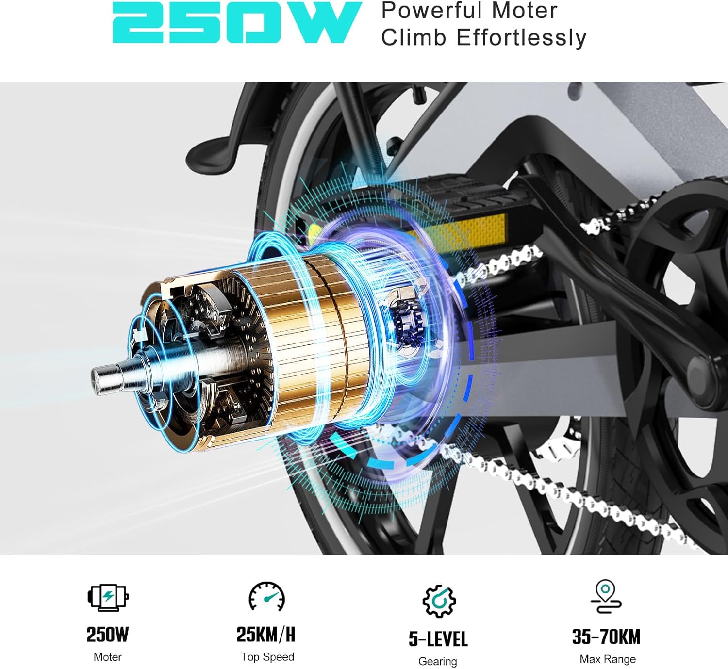 Avec son moteur de 250W et sa batterie lithium amovible de 7,8Ah, ce vélo pliant électrique haute performance vous accompagne sur des distances allant jusqu’à 70 km selon le mode utilisé. Il atteint une vitesse maximale de 25 km/h et grimpe sans difficulté des pentes jusqu’à 25°, vous permettant de circuler avec aisance même sur des routes vallonnées.