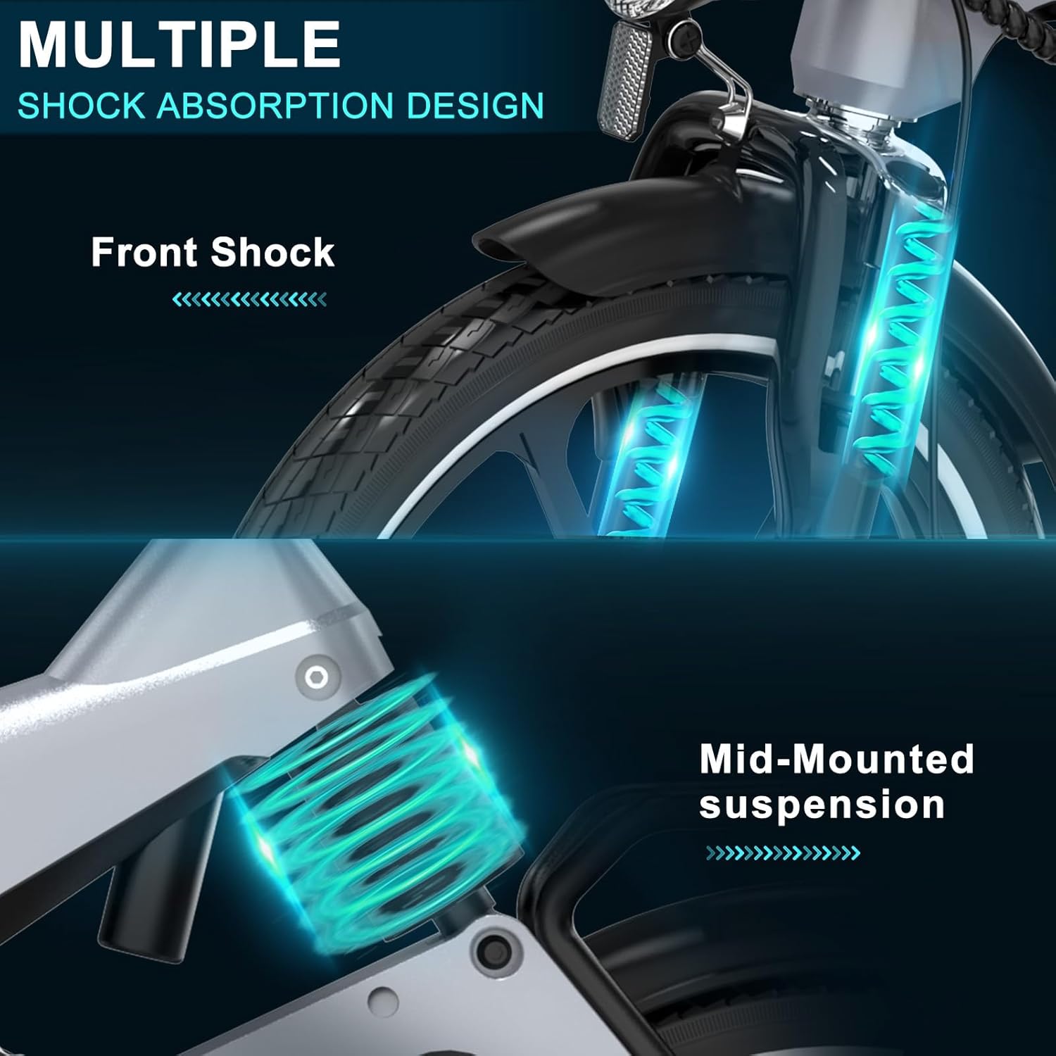 La suspension totale, à l’avant comme à l’arrière, garantit une absorption efficace des chocs, rendant chaque trajet fluide et agréable. Ce vélo urbain à assistance rapide et repliable vous offre une conduite douce, même sur des chaussées abîmées ou irrégulières.