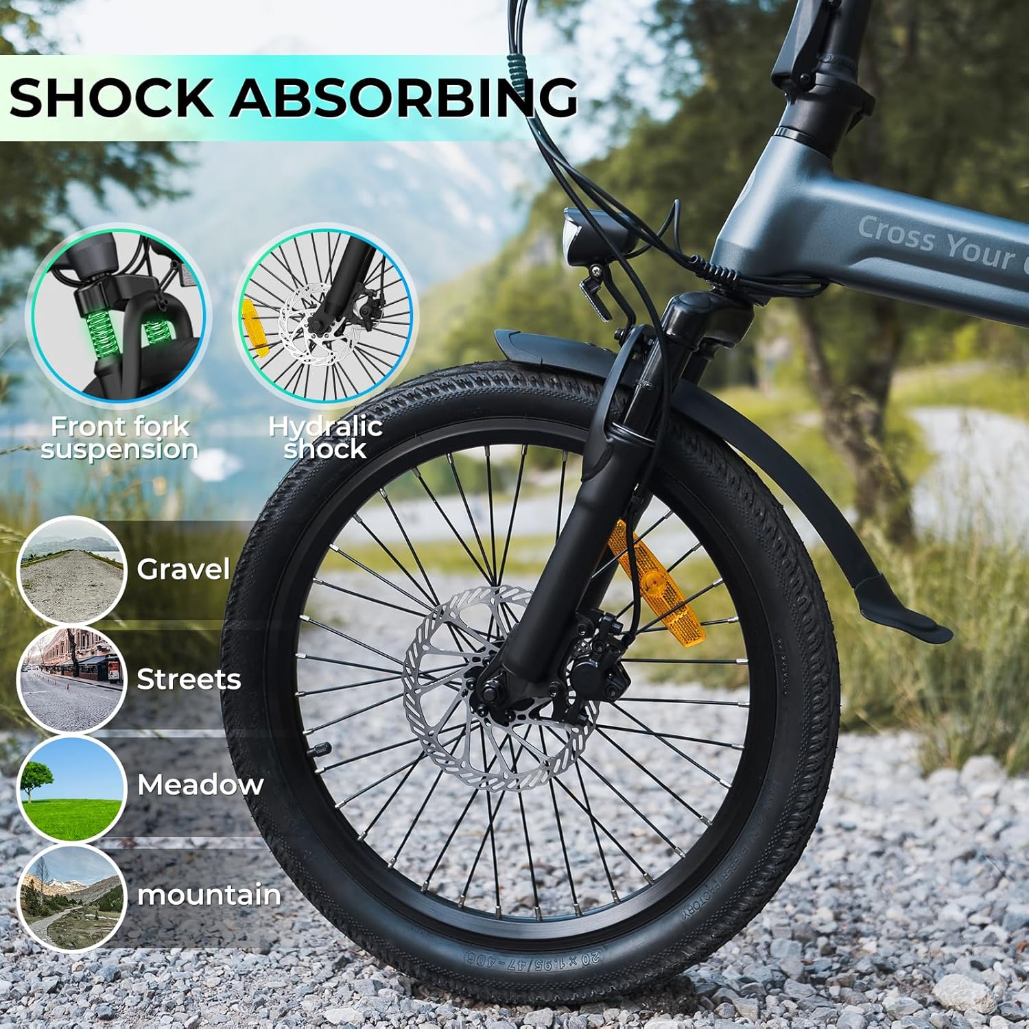 La sécurité de nos utilisateurs est primordiale, c’est pourquoi notre Vélo Électrique Pliant Roues 26 pouces est équipé de freins à disque hydrauliques sur les roues avant et arrière. Ce système de freinage avancé offre une puissance d’arrêt supérieure et un contrôle amélioré, particulièrement dans des conditions difficiles. Les freins hydrauliques dissipent la chaleur de manière plus uniforme et ont une durée de vie prolongée par rapport aux freins mécaniques. De plus, la fourche avant est dotée d’une suspension qui absorbe efficacement les chocs, garantissant une conduite stable et agréable sur diverses surfaces.
