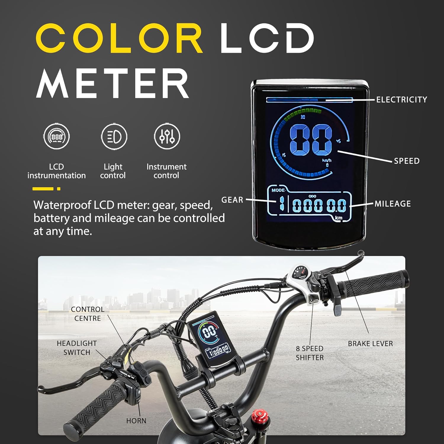 La sécurité est primordiale, c’est pourquoi notre vélo est équipé de freins à disque hydrauliques à l’avant et à l’arrière, assurant un freinage efficace et réactif. Les pneus de 20*4,0″ offrent une adhérence supérieure sur diverses surfaces, qu’il s’agisse de sable, de neige ou de chemins de montagne. Un écran LCD couleur affiche des informations essentielles telles que la vitesse, le niveau de batterie et le niveau d’assistance, tandis que des réflecteurs, un phare à LED et des feux de bande d’assise renforcent votre visibilité.