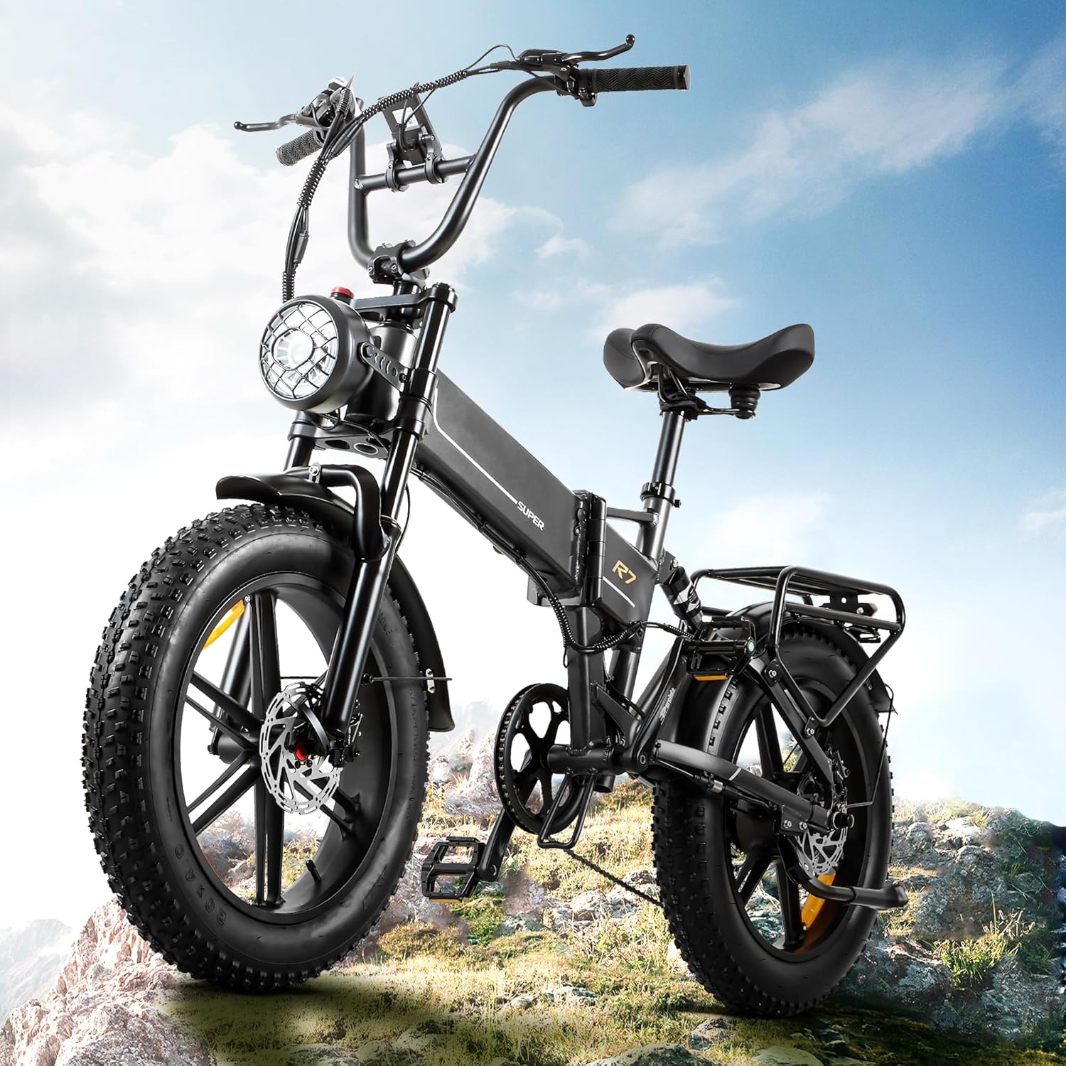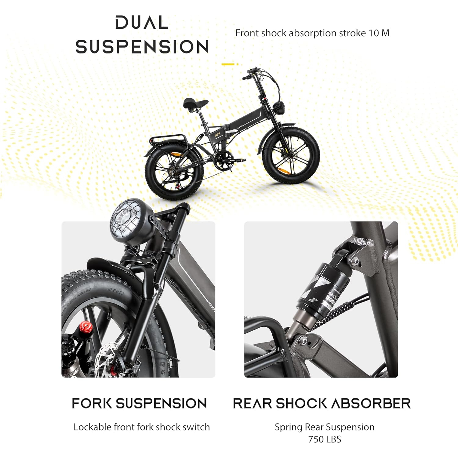 Notre cycle électrique pliable à suspension intégrale est doté d’un système d’amortissement double, comprenant une fourche à suspension en alliage d’aluminium à l’avant et un tube de selle absorbant les chocs à l’arrière. Cette configuration assure une conduite souple et minimise l’impact des irrégularités de la route, même sur les terrains les plus accidentés. Vous bénéficiez ainsi d’un confort accru et d’une meilleure stabilité, rendant vos trajets plus agréables et moins fatigants.