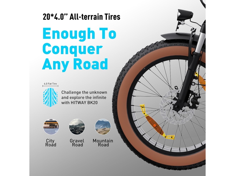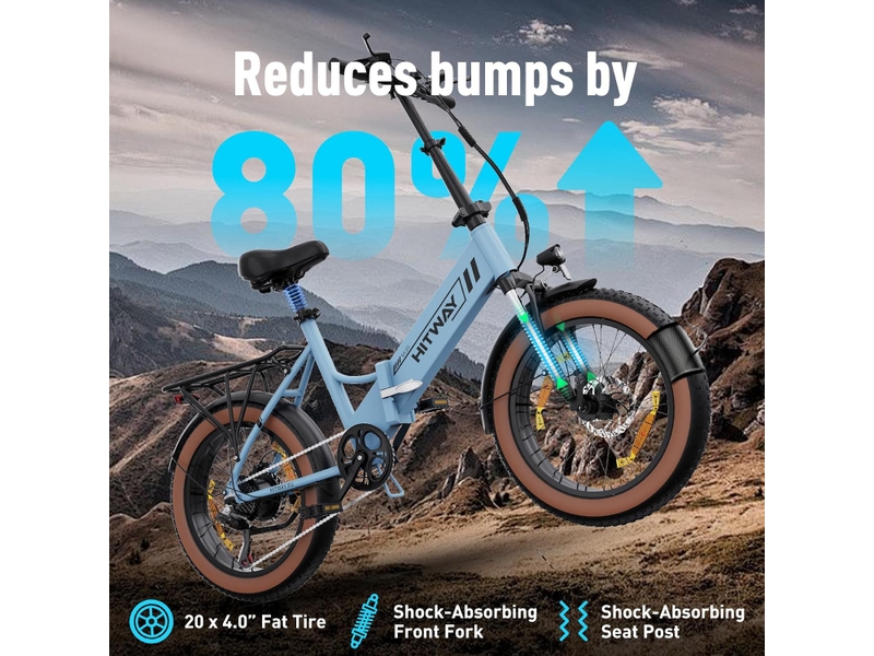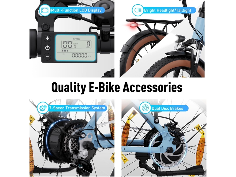 Le confort et la sécurité sont des priorités pour notre cycle électrique pliable. Les pneus de 20×4.0 pouces, associés à une fourche avant amortissante, absorbent efficacement les chocs pour une conduite agréable même sur des surfaces irrégulières. Le système de freinage à double disque, à l’avant et à l’arrière, assure un freinage précis et une sécurité optimale. De plus, l’affichage LCD multifonctionnel vous fournit toutes les informations nécessaires pendant votre trajet, et le phare intégré garantit une excellente visibilité, de jour comme de nuit.