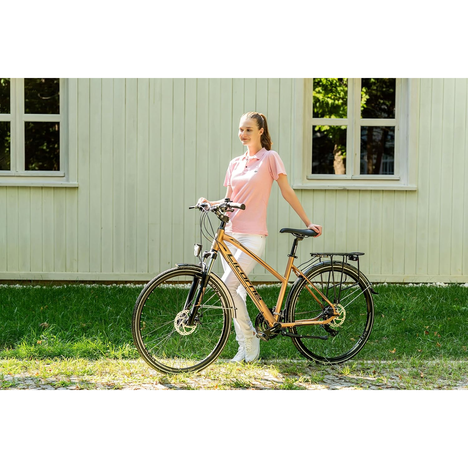 La bicyclette électrique de trekking pour femme dispose d’une suspension avant à fourche qui absorbe efficacement les irrégularités de la route. Le poste de pilotage ergonomique assure une posture droite et réduit la pression sur le dos et les épaules, idéale pour les longues sorties.