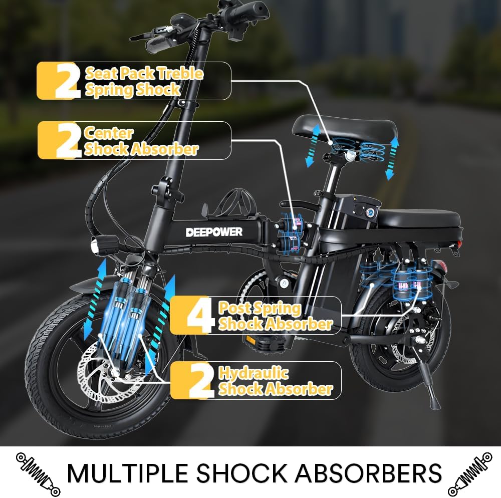 Notre modèle intègre un système d’absorption des chocs complet, conçu pour optimiser votre confort sur divers terrains. Il dispose de quatre zones d’amortissement : un amortisseur central, un amortisseur hydraulique, un amortisseur à double ressort de siège et un amortisseur à ressort de poteau. Cette conception garantit une expérience de conduite douce et agréable, même sur les routes les plus accidentées, réduisant significativement les désagréments liés aux longs trajets avec votre vélo à assistance électrique. Vous ressentirez une stabilité et une fluidité remarquables à chaque sortie.