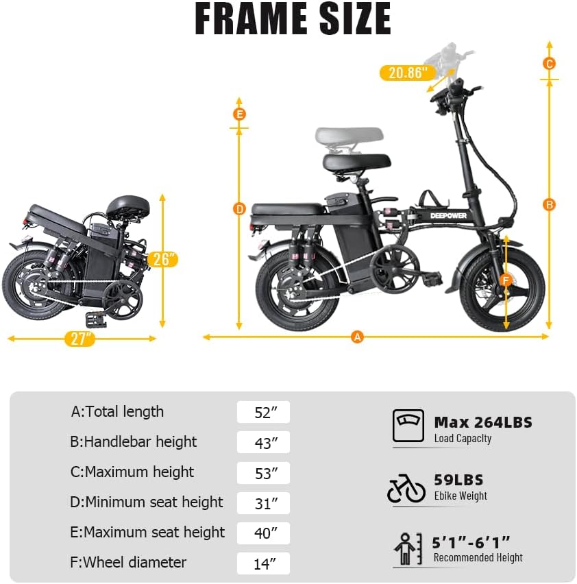 Ce modèle de vélo électrique est conçu pour les adultes. La taille des roues est de 14 pouces. Le cadre pliable et les réglages de la tige de selle et du guidon permettent une adaptabilité pour la plupart des utilisateurs, assurant une position de conduite confortable et sécurisée.