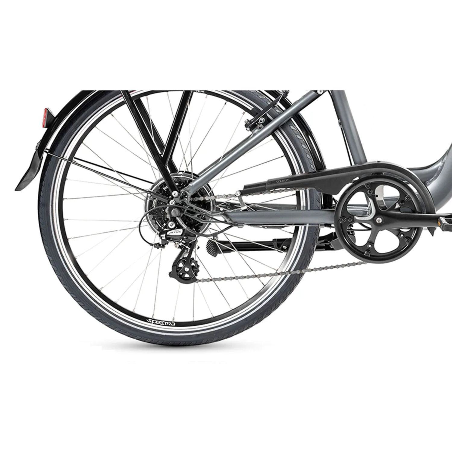 Doté de composants Shimano fiables et d’un système de freinage V-Brake, ce vélo électrifié pour gabarits réduits garantit des changements de vitesse souples et un arrêt efficace, même à pleine vitesse. Le pédalier en aluminium, les pneus avec bandes réfléchissantes et les jantes double paroi complètent cet ensemble performant.