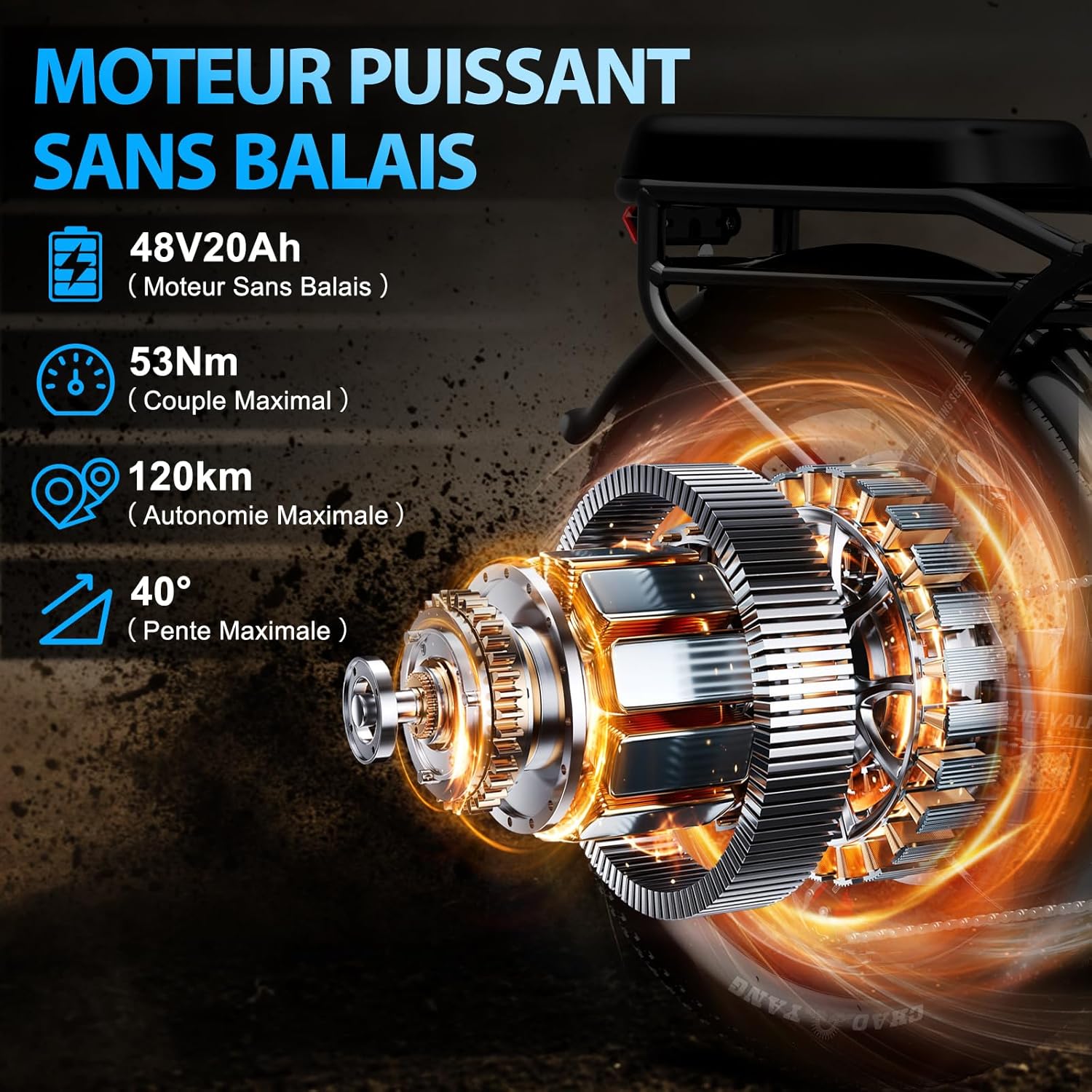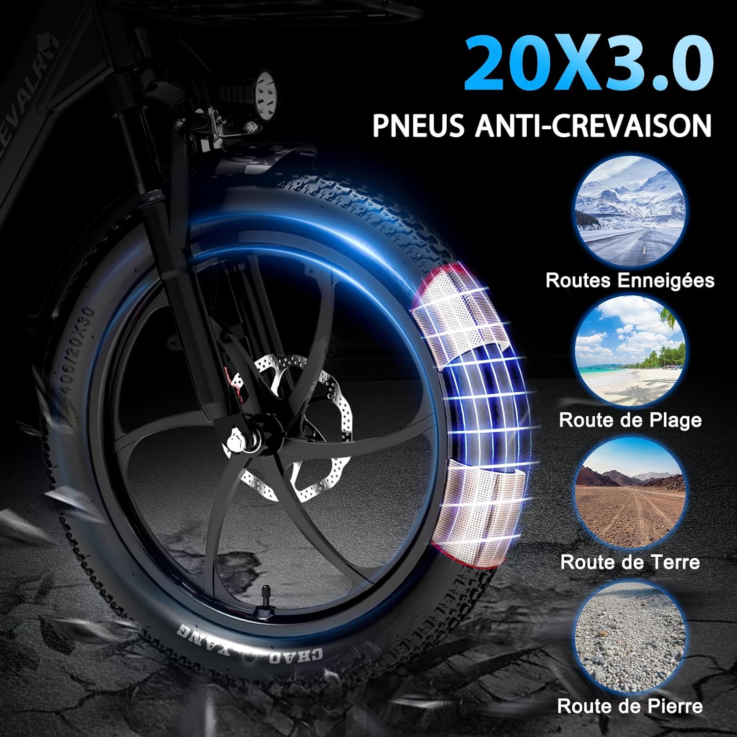 Notre cycle à assistance électrique doté de pneumatiques larges est spécialement équipé pour offrir une adhérence supérieure et une absorption des chocs améliorée. Les pneus de 20 * 3.0 pouces contribuent à une stabilité remarquable, même sur des surfaces irrégulières, et minimisent les vibrations pour une conduite fluide. Cette caractéristique essentielle assure un contact optimal avec le sol, renforçant la sécurité et le confort de l’utilisateur sur divers itinéraires.