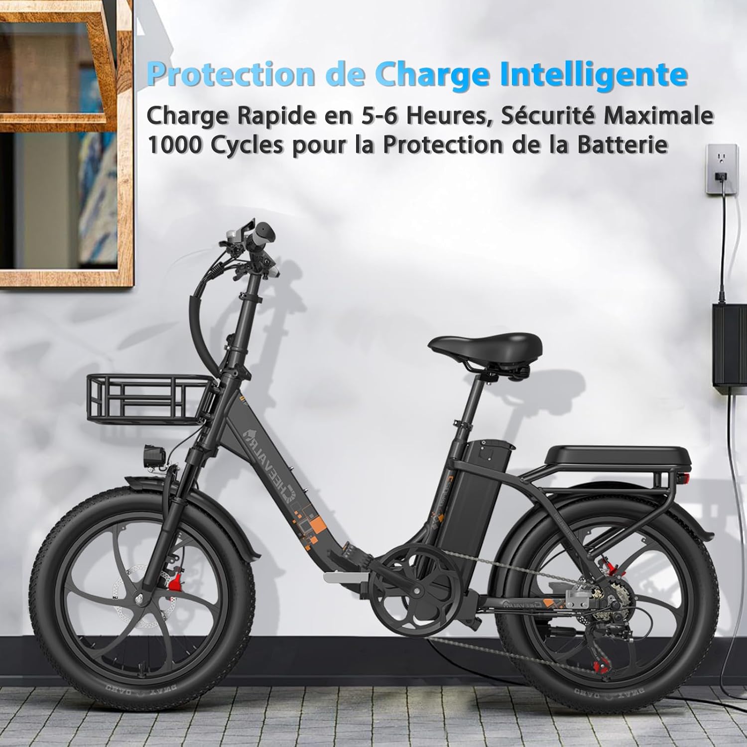 L’alimentation de notre Vélo Électrique Roues Larges est assurée par une batterie amovible de 48V 20Ah, offrant une autonomie conséquente de 50 à 70 km, idéale pour les trajets quotidiens ou les escapades plus longues. Le temps de charge complet est de 6 à 7 heures, vous permettant de planifier sereinement vos utilisations. La conception amovible de la batterie facilite sa recharge et son entretien.