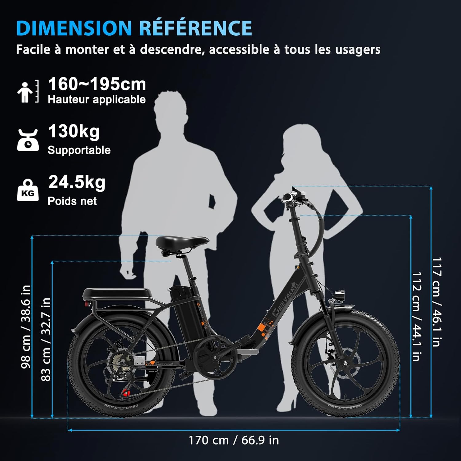 Le cadre de notre vélo motorisé est conçu pour les adultes et supporte une charge maximale de 130 kg. Ses dimensions dépliées sont de 17040112 cm et il pèse 28 kg. Notre design ergonomique vise à offrir une posture de conduite naturelle et confortable pour une large gamme d’utilisateurs.