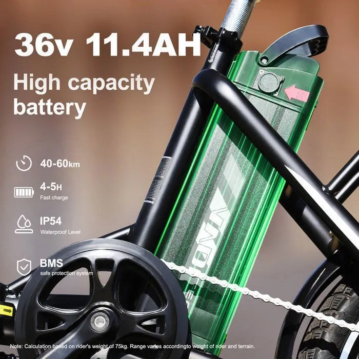 Équipé d’une batterie lithium-ion amovible de 36V et 11.4Ah, notre vélo motorisé vous offre une autonomie impressionnante de 40 à 80 km en mode assistance. Cette plage d’autonomie varie en fonction de facteurs tels que la charge, la température et les conditions routières, mais elle vous assure une grande liberté dans vos déplacements. La batterie est également portable et dotée d’une fonction antivol, ajoutant une couche supplémentaire de sécurité et de praticité à son utilisation.