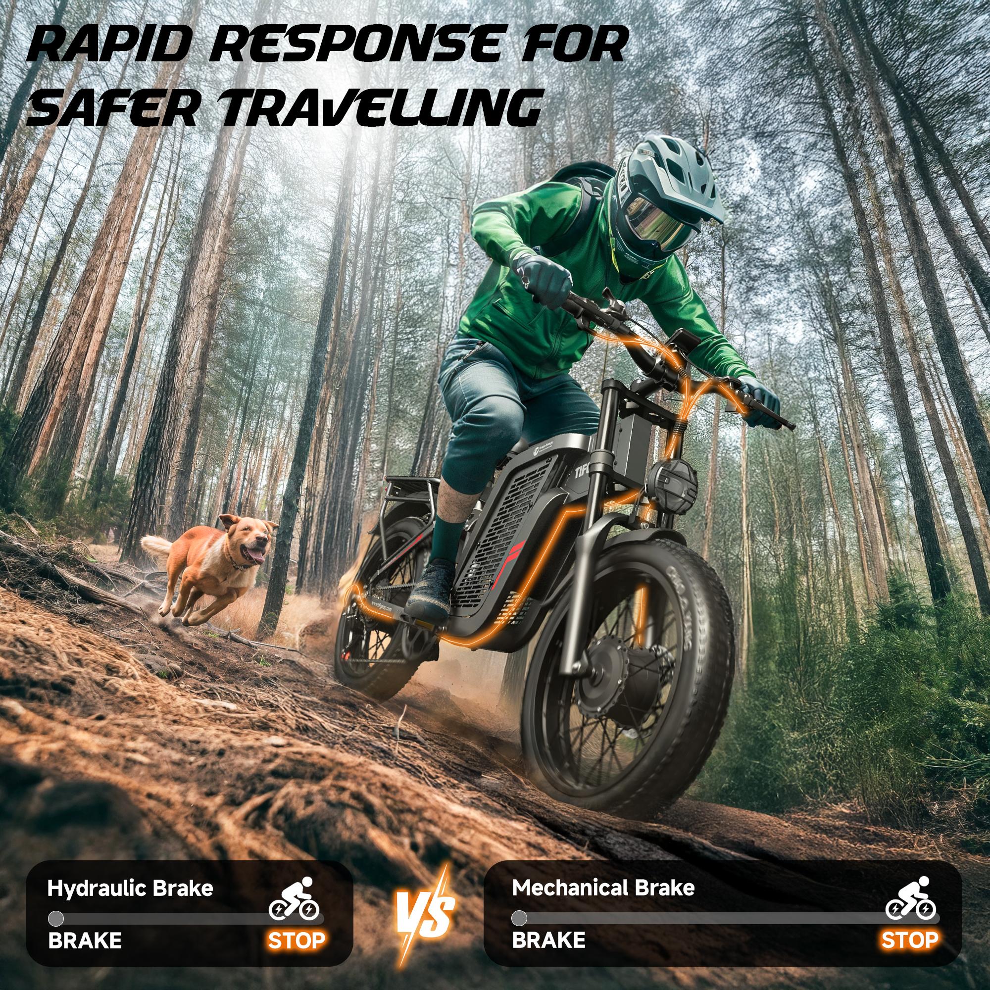 Le Vélo Électrique Motocross Double Freins est équipé de freins à disque hydrauliques doubles, améliorant la réactivité et la stabilité. Cette configuration assure un contrôle fiable dans les descentes et lors des manœuvres brusques.