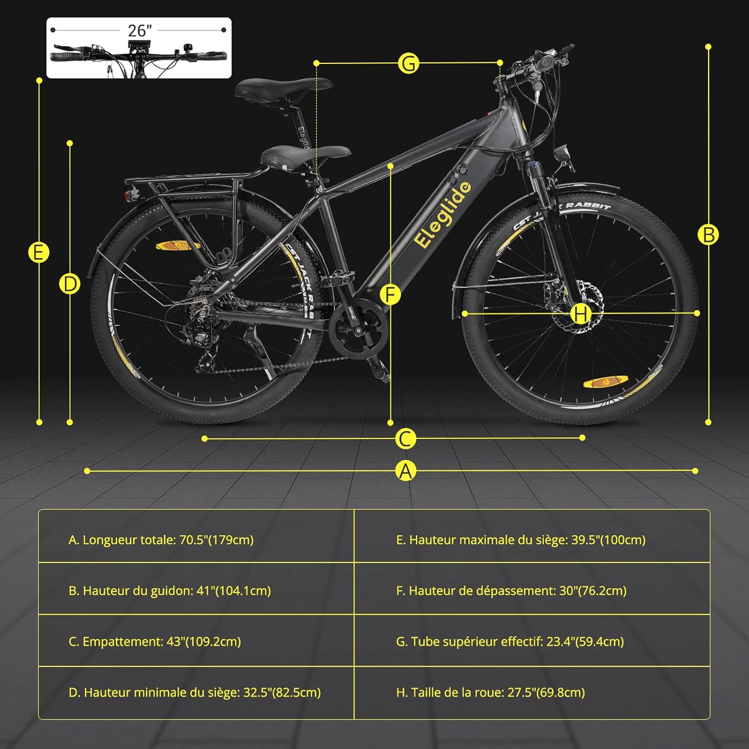 Autres informations : Livré avec un éclairage avant et arrière, des réflecteurs pour une meilleure visibilité, ainsi qu’une trousse à outils et des clés pour l’entretien