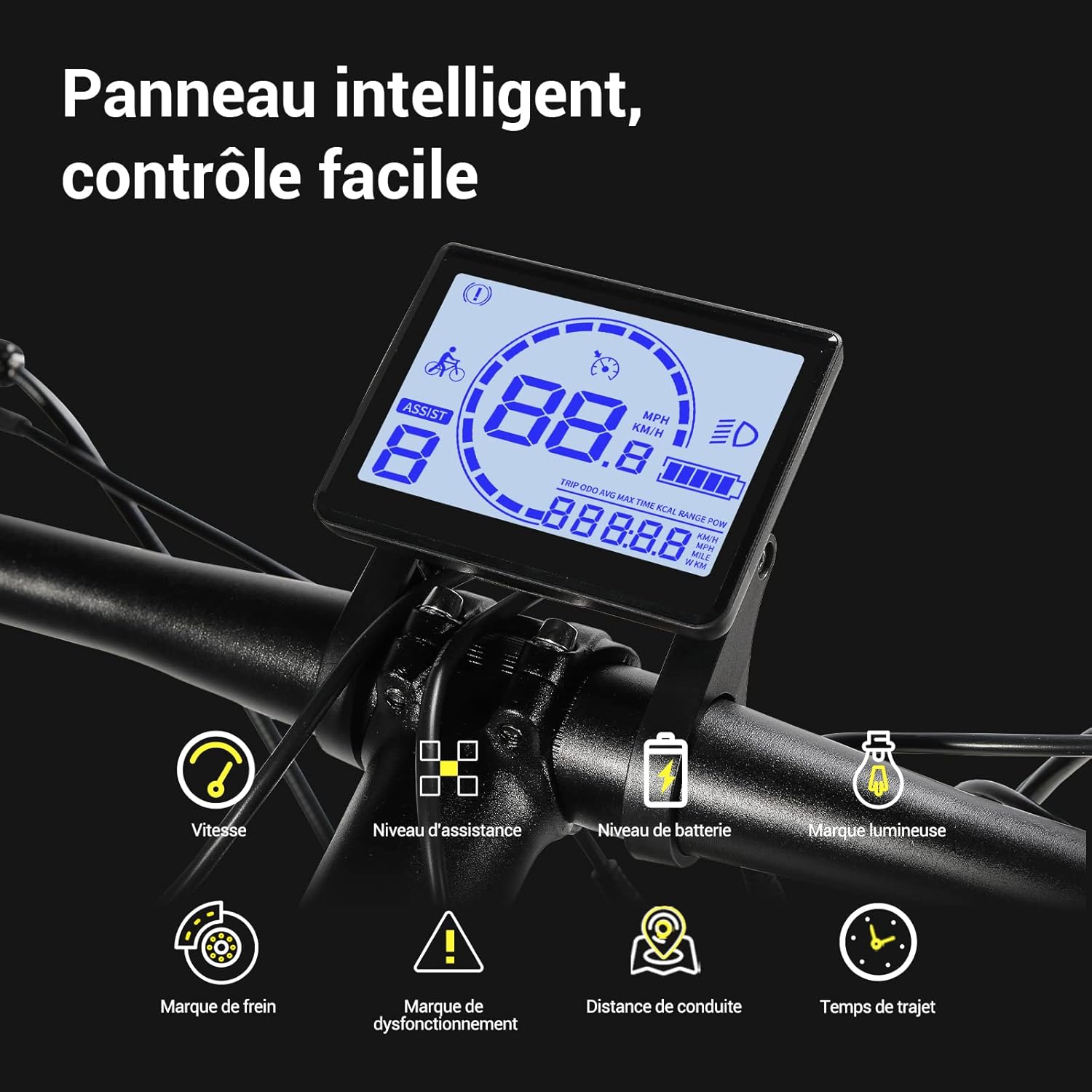 Écran LCD intelligent affichant vitesse, niveau de batterie et mode d’assistance