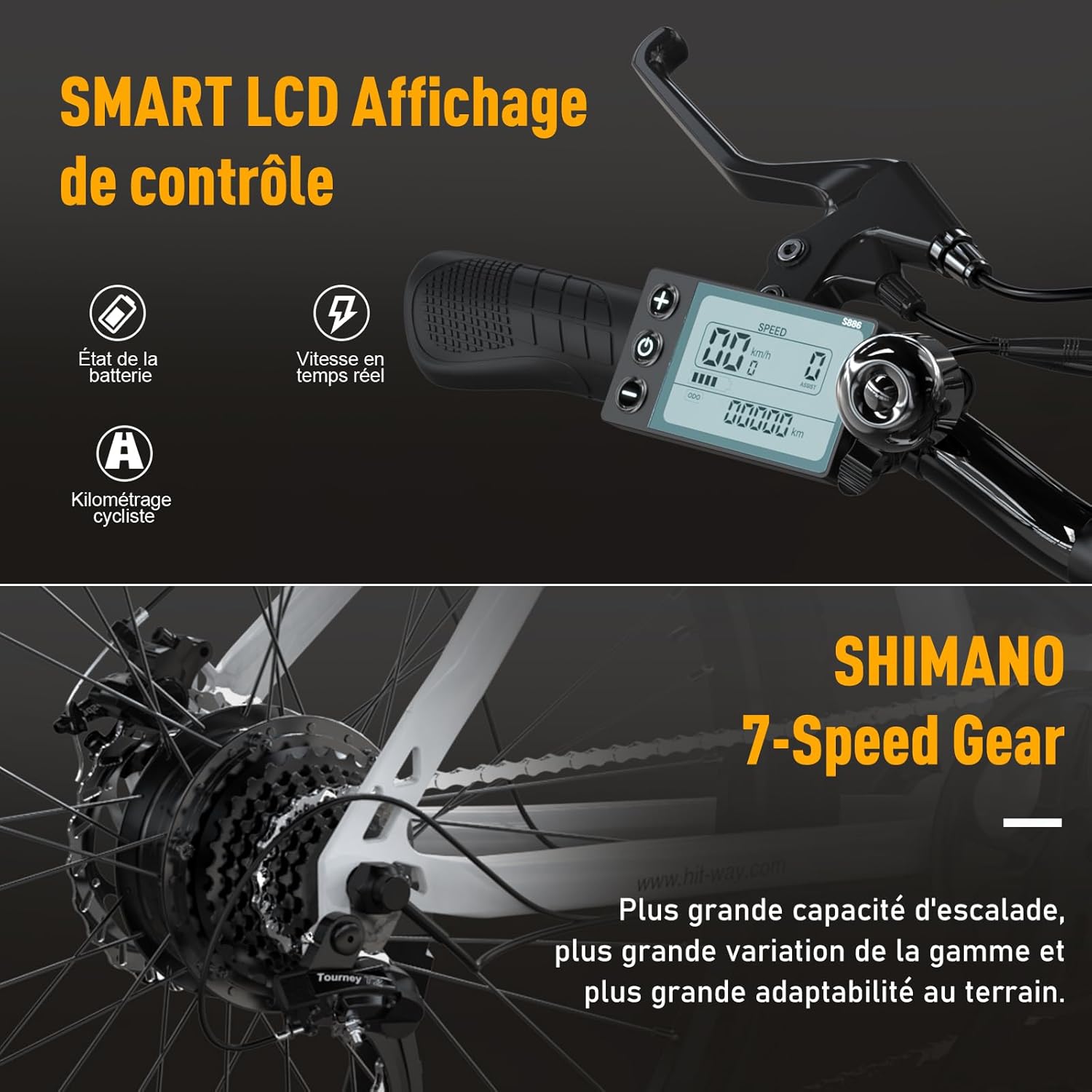 Fabriqué en acier au carbone, notre VTT électrique combine résistance et légèreté, avec un poids de seulement 23,3 kg. Son écran LCD multifonction affiche en temps réel votre vitesse, autonomie et kilométrage, pour un contrôle optimal de votre trajet.