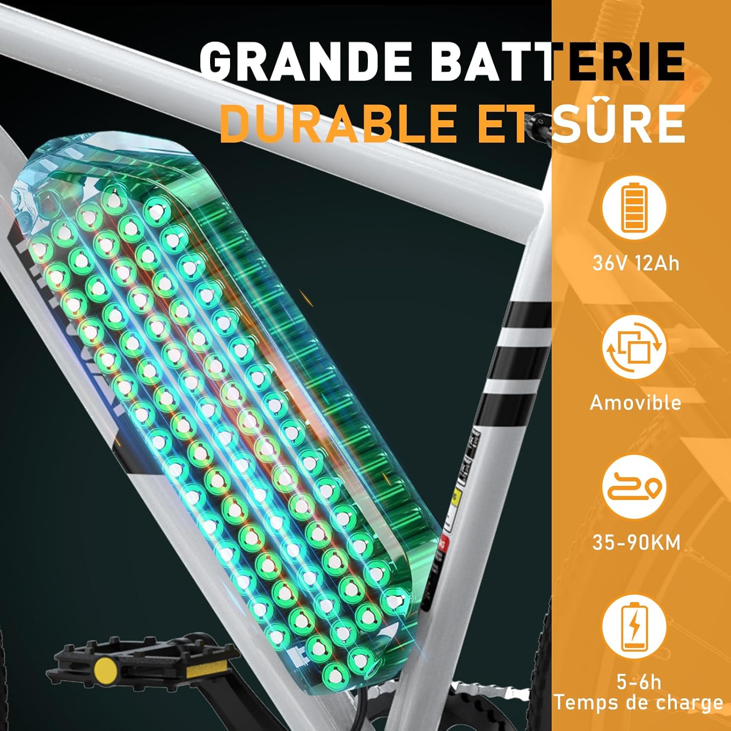 Avec une batterie lithium-ion 36V 12Ah, ce vélo vous accompagne sur 35 à 90 km en une seule charge. Facilement amovible, elle se recharge entièrement en 6 heures, idéale pour vos déplacements quotidiens ou vos escapades en pleine nature sans contrainte.