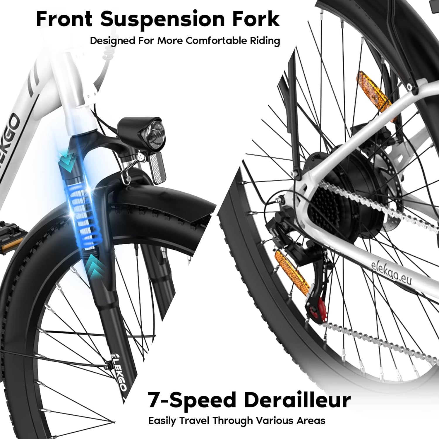 Grâce à sa selle réglable, ce Vélo Ville Électrique Adulte Classic s’adapte à votre morphologie pour un confort personnalisé. Sa suspension à fourche absorbe efficacement les chocs de la route, garantissant une conduite plus douce et agréable, même sur les pavés et routes irrégulières.