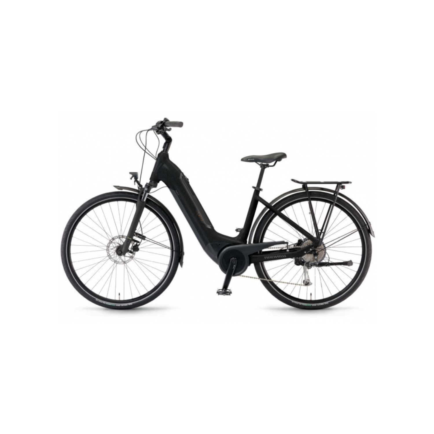 Le confort est au cœur de la conception de notre vélo. Il est doté d’une fourche SR Suntour NEX E25 à ressort acier, offrant un débattement de 63mm pour absorber les irrégularités de la route et des chemins. Les pneus Schwalbe Road Cruiser de 50-622 avec bandes réfléchissantes assurent une excellente adhérence et une visibilité accrue. La présence d’accessoires pratiques tels que des garde-boues, des éclairages intégrés et un porte-bagages renforce sa polyvalence, le rendant prêt pour toutes les situations.