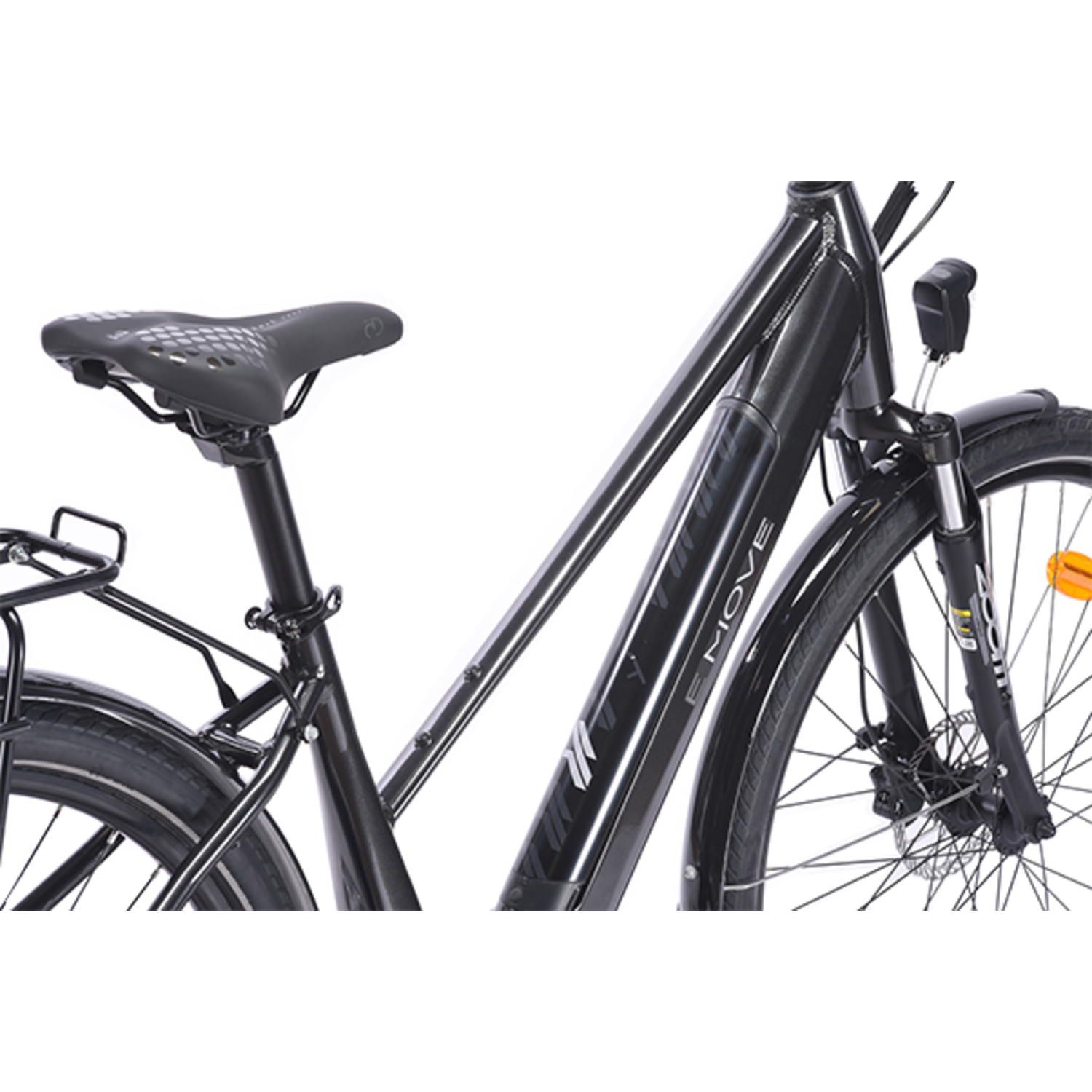 Notre vélo à assistance motorisée via pédalier central est conçu pour maximiser votre confort, grâce à sa fourche suspendue absorbant les chocs et son équipement complet : garde-boue, porte-bagage, béquille, et éclairage indépendant. La roue avant et la selle sont équipées de systèmes de démontage rapide pour un réglage simple et sans outil.