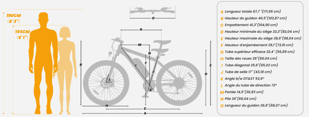 Notre modèle est proposé avec une taille de cadre de 26 ou 29 pouces, conçue pour s’adapter à une large gamme de cyclistes adultes. Le matériau du cadre est en aluminium, choisi pour sa légèreté et sa robustesse, offrant un équilibre optimal entre maniabilité et durabilité. Ces dimensions permettent à de nombreux utilisateurs de trouver une position de conduite ergonomique et confortable, essentielle pour de longues sorties.
