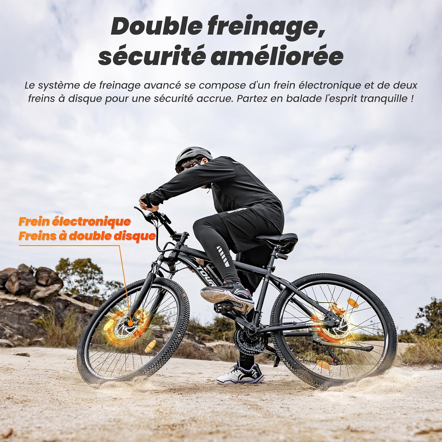 La sécurité est une priorité pour notre VTT Électrique 1000 Euros. Il intègre un système de freinage avancé combinant un frein électrique et des freins à double disque, garantissant une réactivité maximale et un arrêt précis. Notre éclairage est conçu pour répondre à des normes rigoureuses, offrant une efficacité d’éclairage élevée sans éblouir les autres usagers de la route, ce qui augmente votre visibilité. De plus, un instrument compact vous permet de surveiller facilement le niveau de la batterie et de basculer entre trois niveaux d’assistance au pédalage (12, 18 et 25 km/h). Une simple pression sur un bouton active également un mode marche à 6 km/h, facilitant le déplacement du vélo à pied. Cette simplicité d’utilisation vous assure une parfaite maîtrise de votre déplacement.