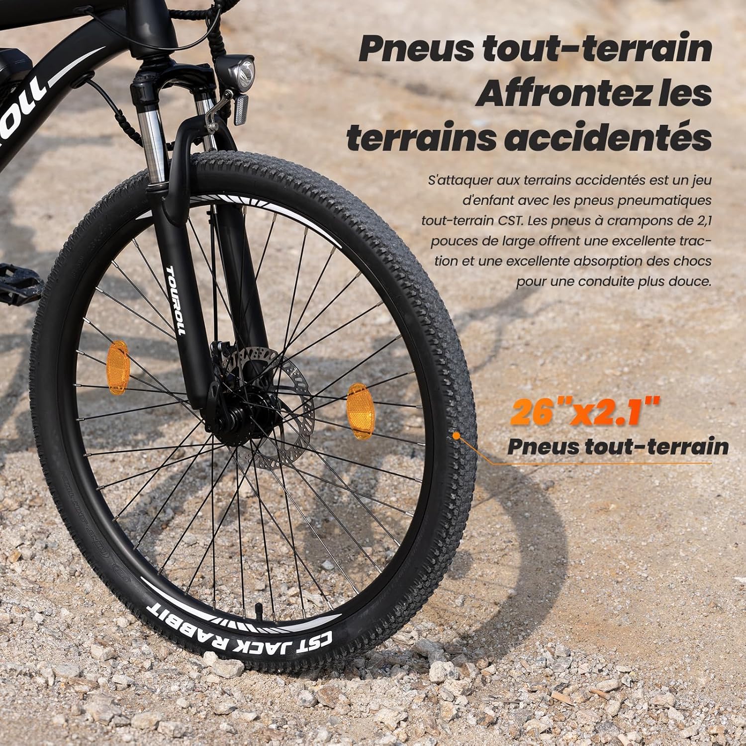 Pour une conduite d’un confort et d’une fluidité accrus, notre deux-roues motorisé est équipé de roues de 26 pouces qui absorbent aisément les obstacles et les irrégularités du terrain. Les pneus CST de 2,1 pouces de large offrent une adhérence supérieure et une meilleure stabilité. Leur surface à crampons contribue à réduire les chocs, permettant une progression en douceur même sur des chemins accidentés. La suspension fiable intégrée à la fourche diminue significativement l’impact des secousses, vous invitant à parcourir des routes cahoteuses avec assurance et plaisir.