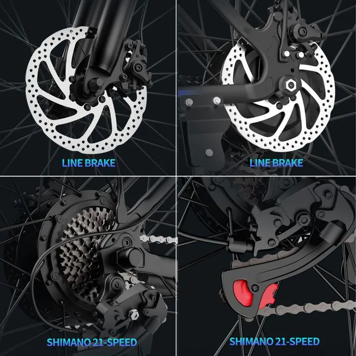 Notre VTT Électrique est doté d’un système de transmission Shimano à 21 vitesses, vous offrant une précision et une flexibilité inégalées pour adapter votre effort à tous les types de terrains. Que vous montiez une pente raide ou rouliez sur du plat, le changement de vitesses est fluide et efficace. Les freins à disque mécaniques assurent un freinage puissant et réactif dans toutes les conditions météorologiques, garantissant votre sécurité et un contrôle optimal de votre trajectoire. Cette combinaison de technologies assure une maîtrise parfaite de votre vitesse, pour une conduite sûre et dynamique.