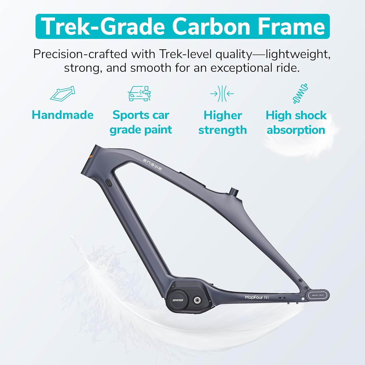 Notre deux-roues motorisé de haute catégorie intègre un châssis monobloc en fibre renforcée qui lui confère une rigidité exceptionnelle et un poids allégé. Cette structure améliore non seulement la stabilité et la maniabilité, mais aussi l’efficacité de pédalage. Plus léger de 19 kg par rapport aux modèles standards, ce cadre assure des déplacements plus rapides et moins fatigants, en particulier en milieu urbain.