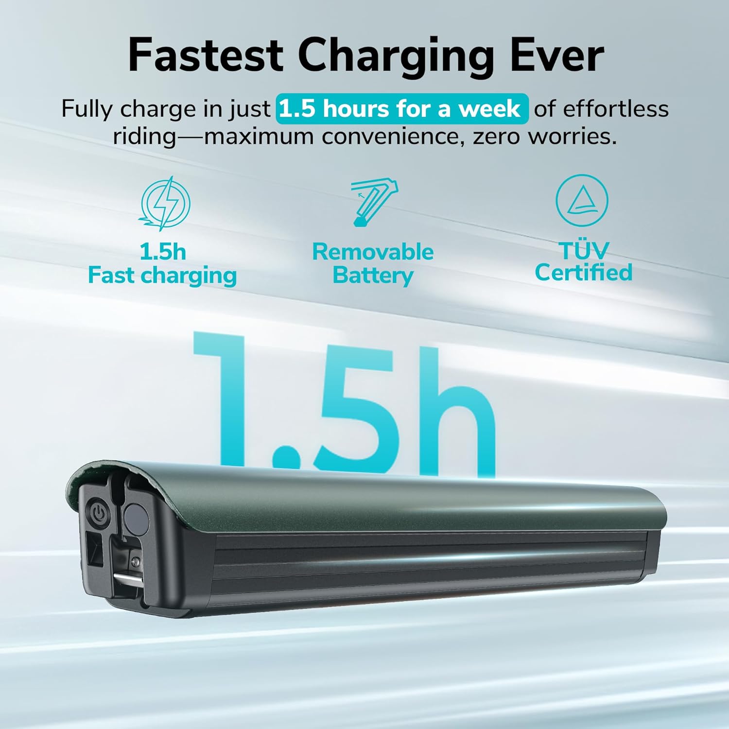 Ce cycle électrique à batterie intégrée est doté d’une puissance de 36V 10Ah permettant de parcourir jusqu’à 100 km en mode assistance. Grâce à sa fonction de charge rapide 8A, la batterie se recharge complètement en 1,5 heure, ce qui optimise votre temps et votre liberté de mouvement. Elle est équipée de cellules haut de gamme et d’un système BMS performant pour limiter la perte d’énergie et allonger sa durée de vie.