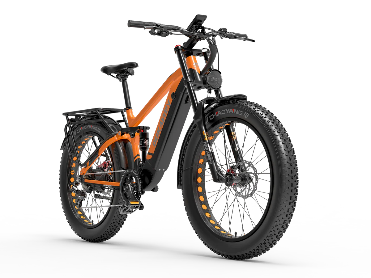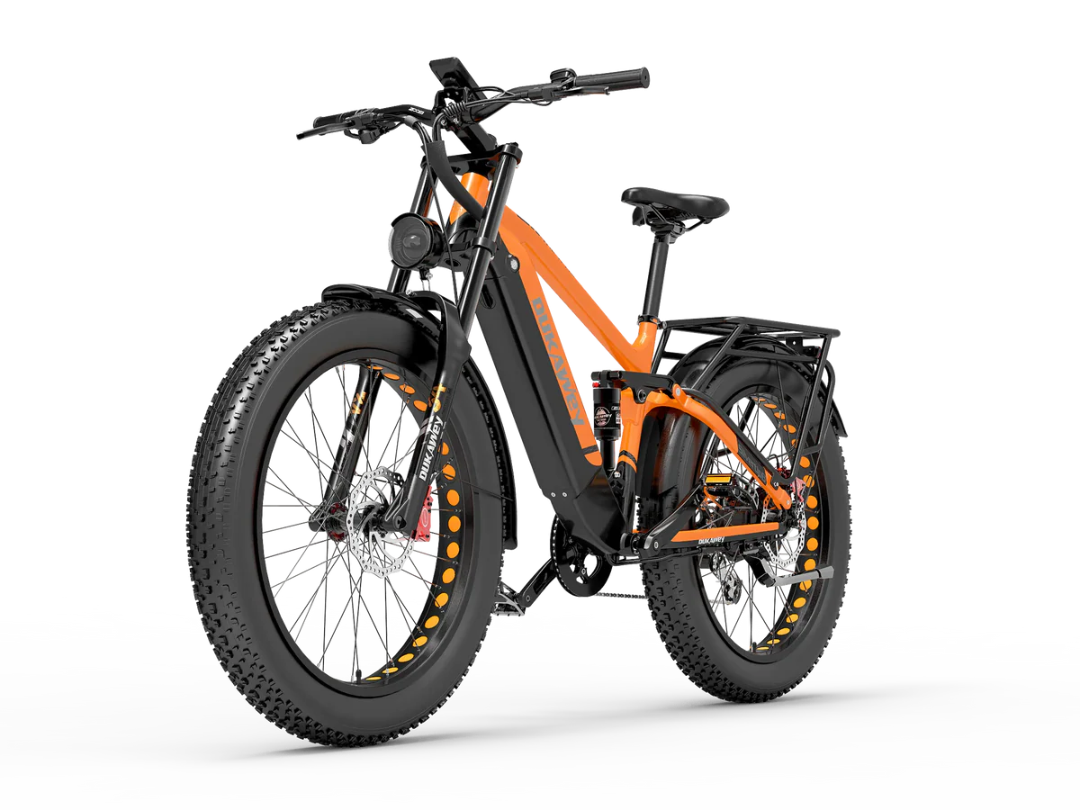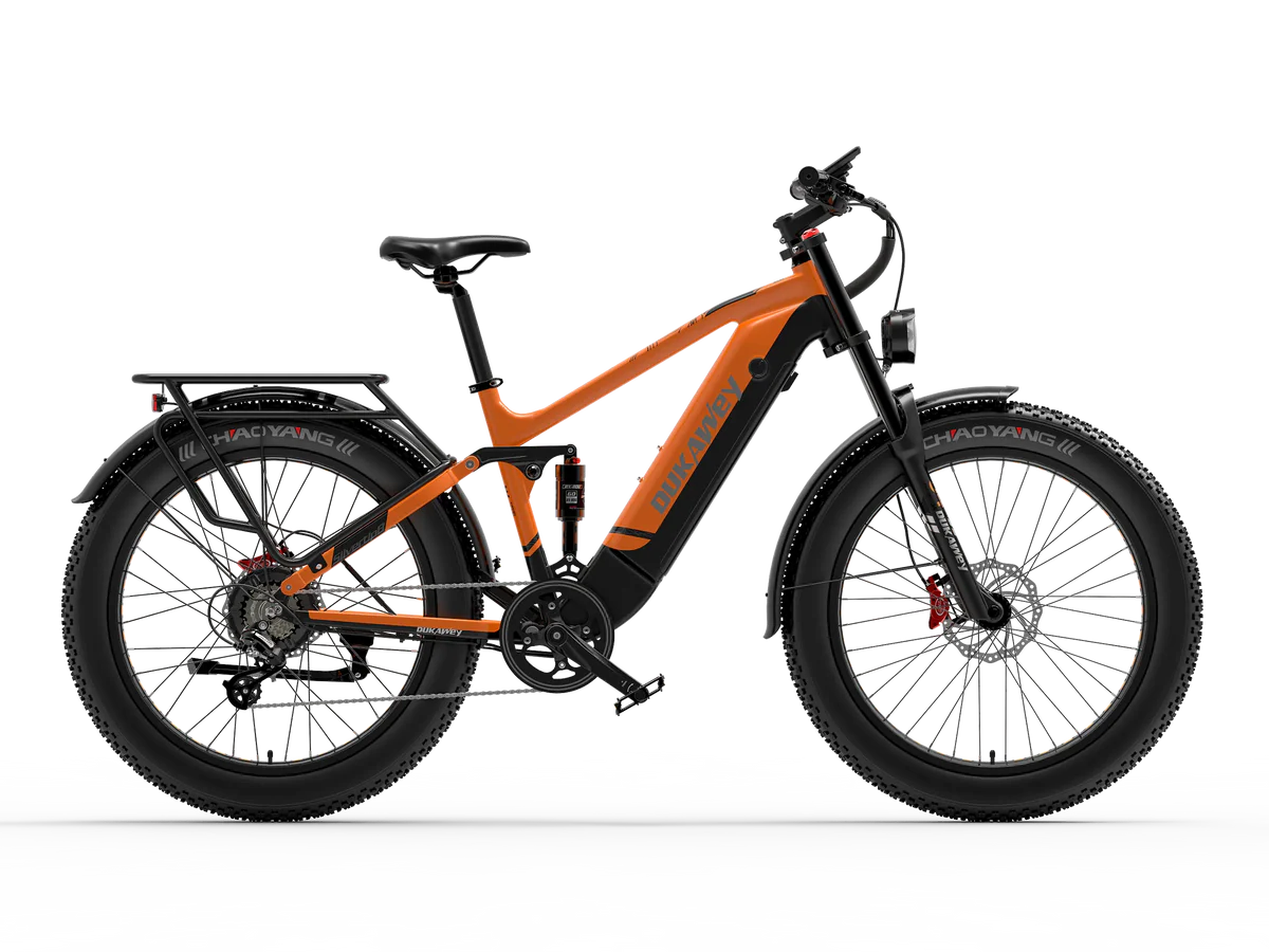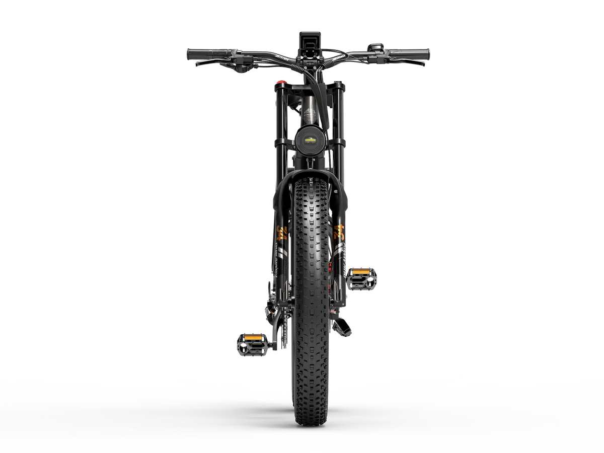 Le Fatbike électrique tout-suspendu est doté d’une fourche à suspension à ressort à huile à double épaulement et d’un amortisseur arrière pneumatique. Ce système d’amortissement complet absorbe efficacement les chocs, assurant une conduite stable et confortable sur les terrains irréguliers.