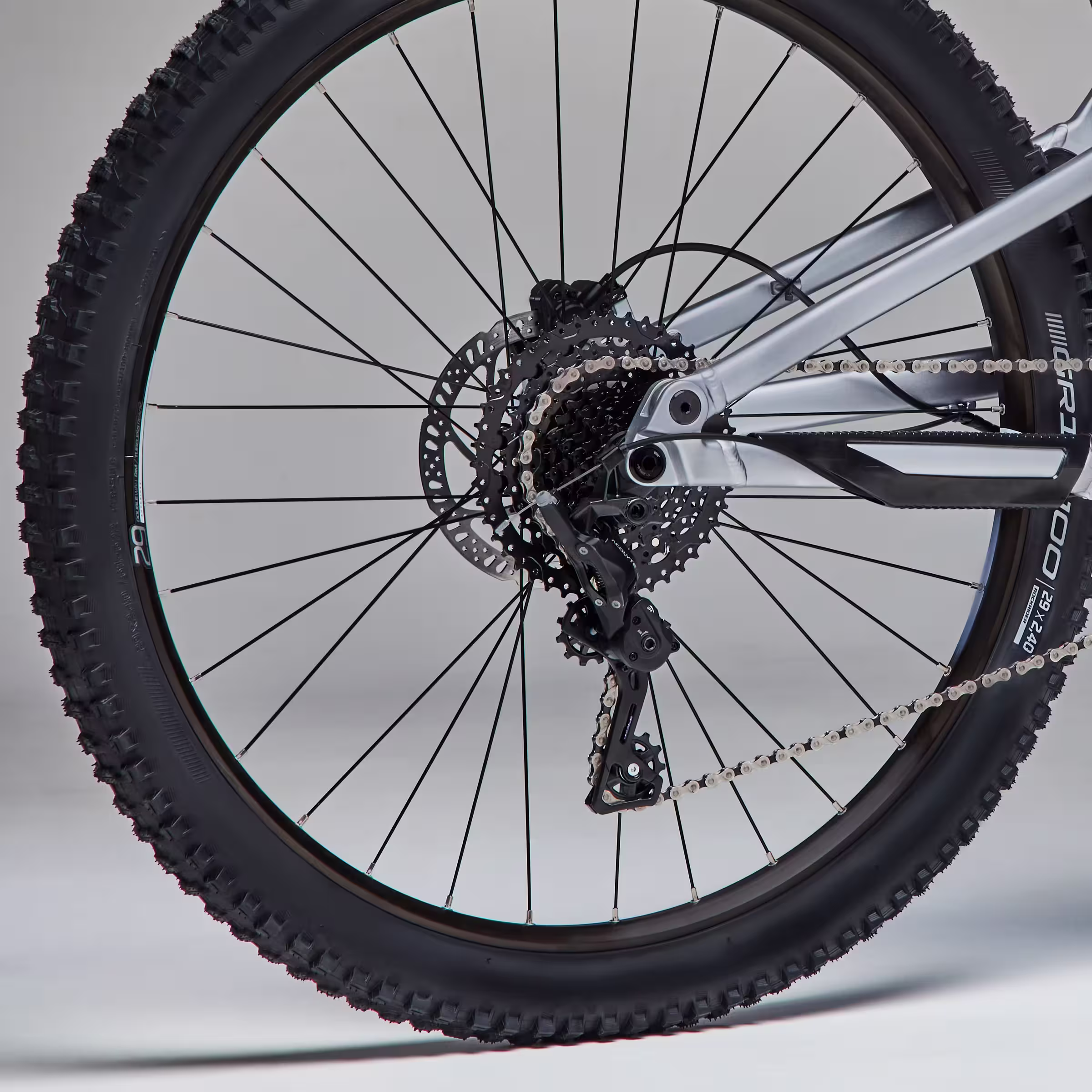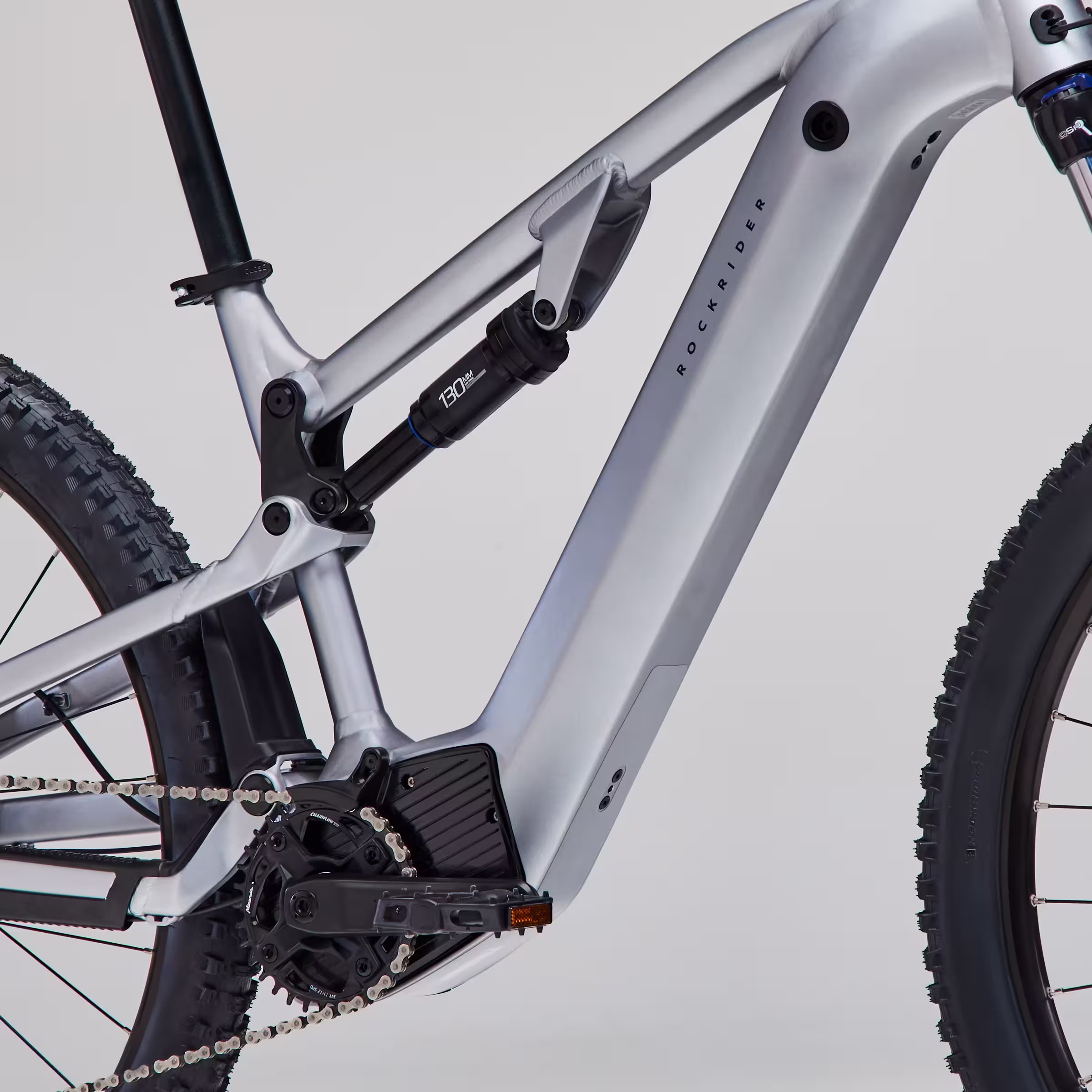 Les roues ROCKRIDER 29″ sont compatibles avec des pneus larges jusqu’à 2,6″, offrant une adhérence supérieure et une meilleure stabilité sur les sentiers accidentés. Le poste de pilotage, composé d’un cintre ROCKRIDER SPORT et d’une potence ROCKRIDER, assure une ergonomie et une précision de conduite appréciables. Chaque composant de ce vélo à double suspension électrique est choisi pour sa durabilité et sa capacité à vous accompagner dans toutes vos aventures.